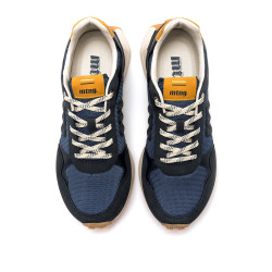Zapatillas de color azul marino para hombre de la marca mtng, modelo Zinc de estilo retro running. Este diseño combina paneles de malla con refuerzos y detalles mostaza, aportando un look dinámico y urbano. La suela dentada en color caramelo aporta un acabado vintage e incorpora tecnología Extralight, lo que las hace más ligeras. El logo lateral bordado mantiene la esencia de la marca, y el cierre con cordones bicolor y sus plantillas con tecnología Starfit, mejoran la comodidad en cada paso. Con certificado VEGANO sellado por INESCOP, el cual garantiza que la naturaleza química principal del material no se corresponde con fibras de origen animal.