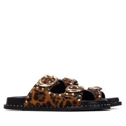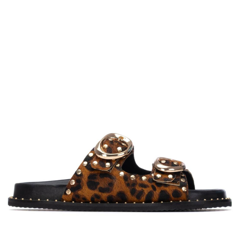 Sandalia de mujer, de la marca Carmela. Fabricado en piel de alta calidad. Decorado con un diseño animal print con apliques metálicos. Tachas decorativas en el lateral. Hebillas funcionales para un buen ajuste. Cómoda planta para disfrutar de los días de verano. Suela antideslizante.