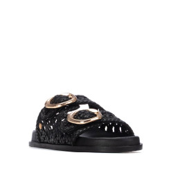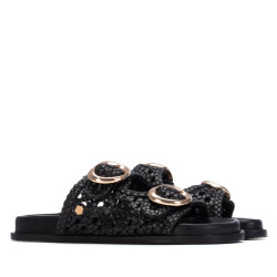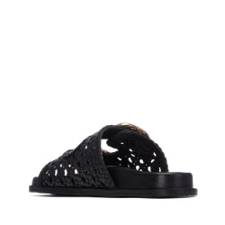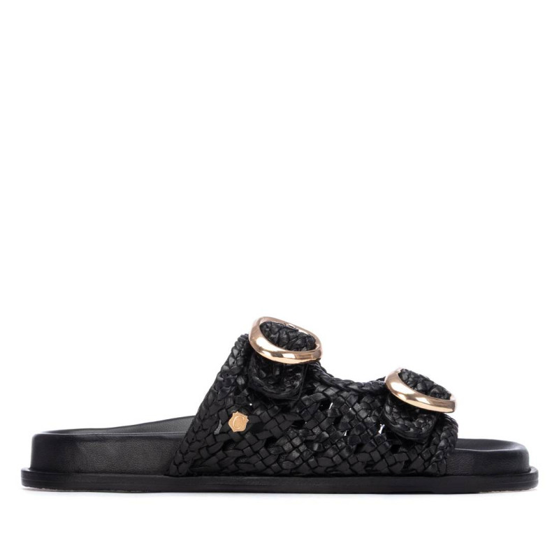 Sandalia de mujer, marca Carmela. Fabricada en piel de alta calidad decorada con un diseño picado en acabado metalizado. Hebillas funcionales para un buen ajuste. Cómoda planta para disfrutar de los días de verano. Suela antideslizante.