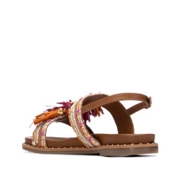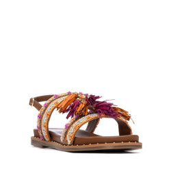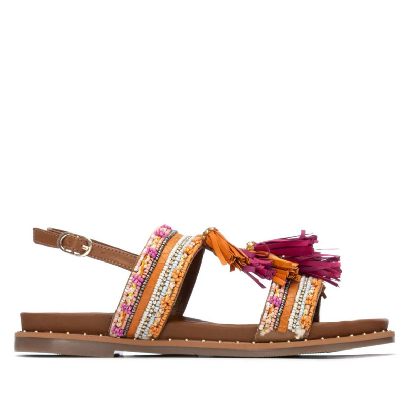Sandalia de mujer, marca Carmela. Diseño en pedrería con elementos decorativos que le dan un toque fresco y veraniego. Cierre con hebilla al tobillo para una mejor sujeción Cómoda planta y suela antideslizante.