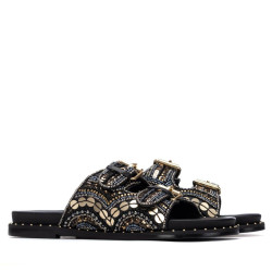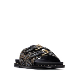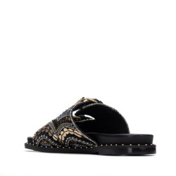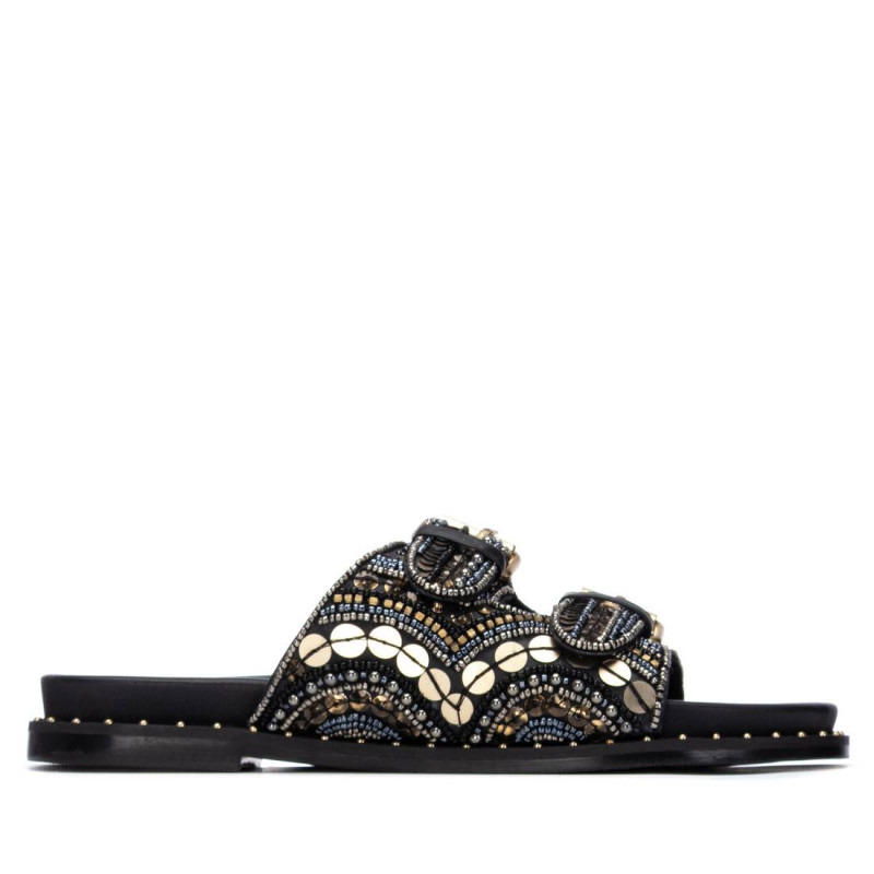 Sandalia de mujer, de la marca Carmela. Diseño en pedrería multicolor que le dan un toque fresco y veraniego. Hebillas funcionales para un buen ajuste y cómoda planta con apliques decorativos en el lateral. Suela antideslizante.