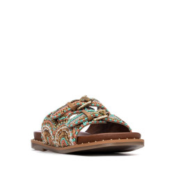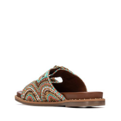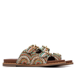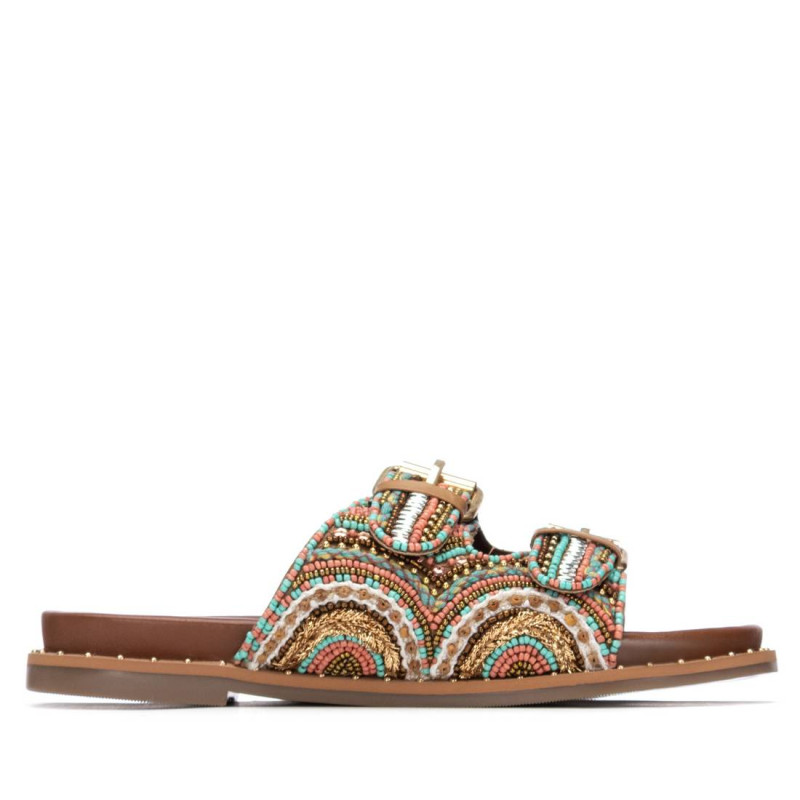 Sandalia de mujer, de la marca Carmela. Diseño en pedrería multicolor que le dan un toque fresco y veraniego. Hebillas funcionales para un buen ajuste y cómoda planta con apliques decorativos en el lateral. Suela antideslizante.