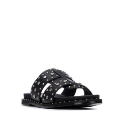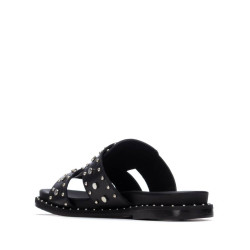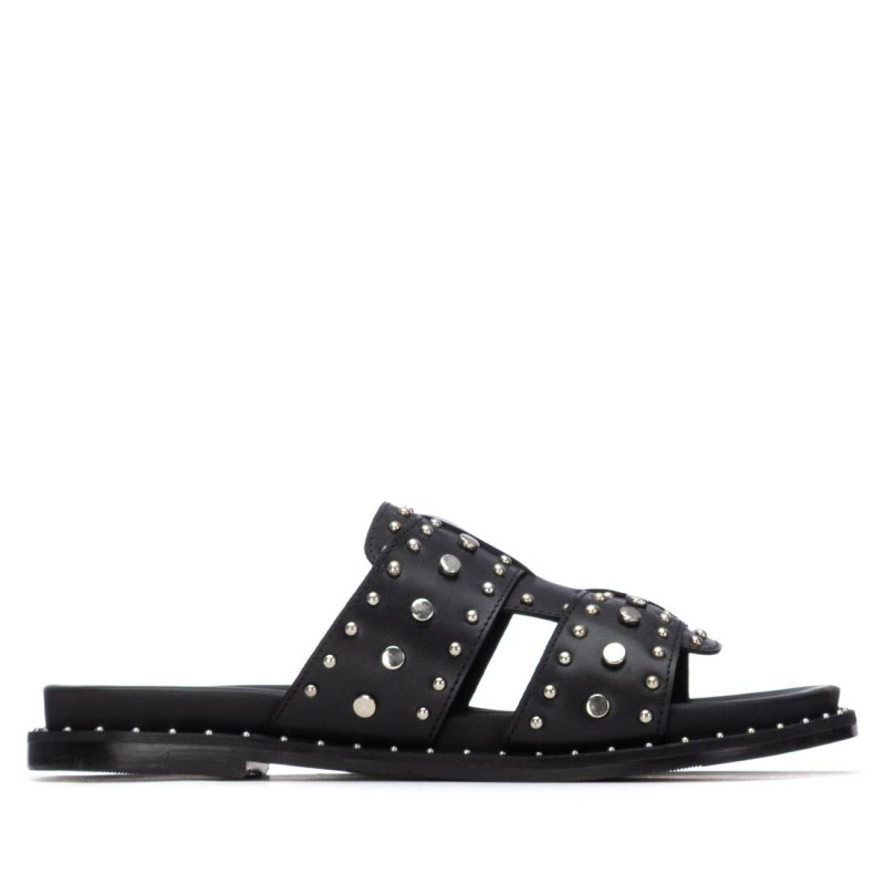 Sandalia de mujer, marca Carmela. Fabricada en piel de alta calidad. Modelo con apliques metálicos y tachas decorativas en el lateral. Cómoda planta y suela de goma antideslizante.