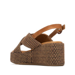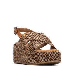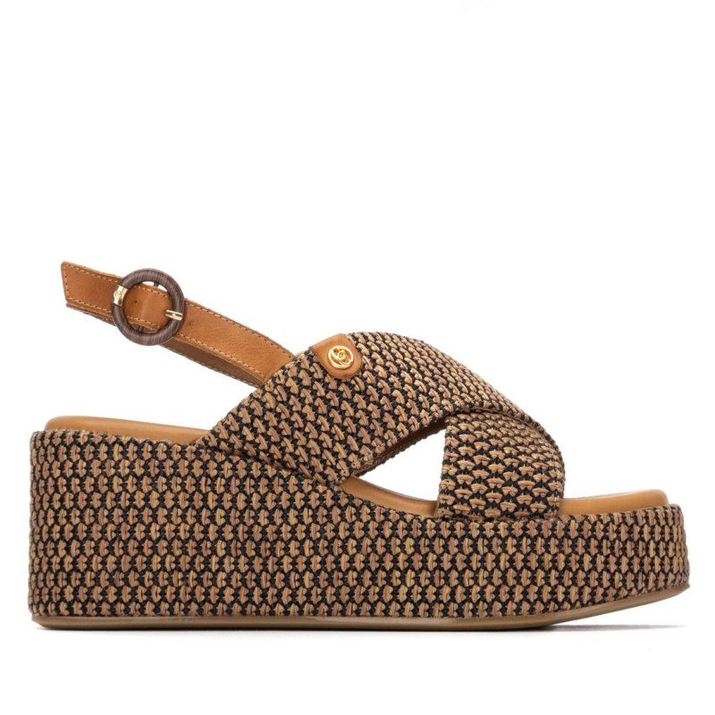 Sandalia de mujer, marca Carmela. Fabricada en material tipo rafia. Pala de tiras cruzadas y diseño trenzado . Cierre mediante correa al tobillo con hebilla. Cómoda planta y plataforma de 8 cm. Suela antideslizante.
