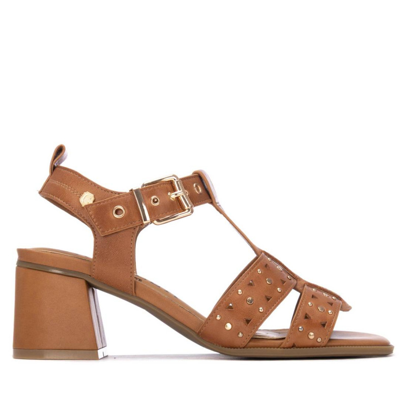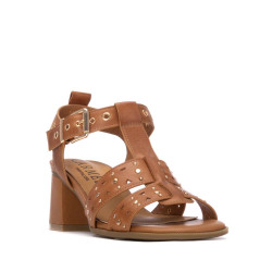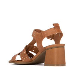 Sandalia de mujer, marca Carmela. Fabricada piel de alta calidad. Diseño con calados y apliques metálicos. Cierre mediante correa al tobillo con hebilla. Cómoda planta y tacón ancho de 7 cm. Suela antideslizante.