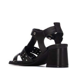 Sandalia de mujer, marca Carmela. Fabricada piel de alta calidad. Diseño con calados y apliques metálicos. Cierre mediante correa al tobillo con hebilla. Cómoda planta y tacón ancho de 7 cm. Suela antideslizante.