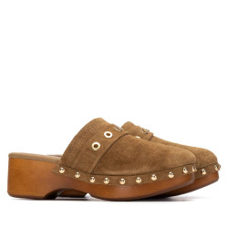 Zapato de mujer, marca Carmela. Fabricado en serraje de alta calidad. Únete a la tendencia de los zuecos con este modelo atemporal, con apliques y tachas decorativos en el lateral. Tacón ancho de 6 cm con plataforma delantera para mayor comodidad. Suela antideslizante