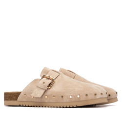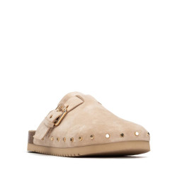 Zapato de mujer, marca Carmela. Fabricado en serraje de alta calidad. Únete a la tendencia de los zuecos con este modelo atemporal, con calados, apliques y tachas decorativos en el lateral. hebilla decorativa que le da un toque de elegancia. Suela antideslizante.