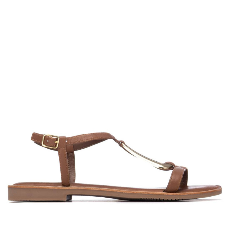 Sandalia de mujer, marca Carmela. Fabricada piel de alta calidad. Diseño de tiras con adorno metálico frontal para aportar mayor elegancia. Variedad de colorido que combinará con todos tus looks de esta temporada. Tira trasera con cierre de hebilla para una mejor sujeción. Cómoda planta y suela de goma antideslizante.