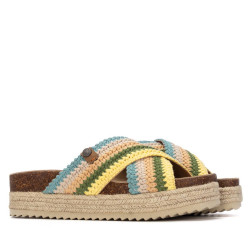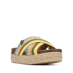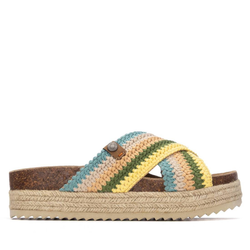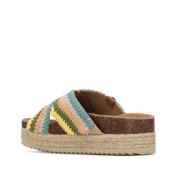 Sandalia de mujer, de la marca Refresh. Fabricada en tejido en una combinación de colores. Diseño de dos tiras cruzadas. Cómoda planta bios. Piso rodeado con yute trenzado. Con suela de goma canalada.