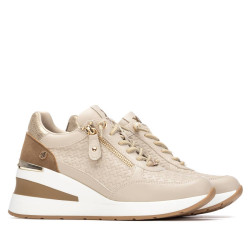 Zapatilla de mujer, de la marca Xti. Fabricada en material que imita la piel, presenta un bonito grabado con el logo de la marca que aporta un detalle distintivo y elegante. Cuenta con cordones y cremallera lateral para un calce rápido y cómodo. Incorpora una cuña de 7 cm que proporciona altura y confort, perfecta para un estilo casual con un toque moderno. Este modelo ha obtenido el certificado vegano por la organización mundial PETA (Organización de los derechos de los animales).