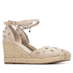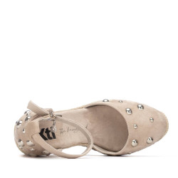 Alpargata de mujer, de la marca Xti. Modelo fabricado en suave antelina, decorado con bonitas tachas redondas que aportan un toque moderno y elegante. Presenta talón cerrado y una tira que sujeta al tobillo con cierre mediante hebilla para una sujeción segura y cómoda. Cuenta con una cuña alta forrada en yute, que ofrece altura y estilo. Este modelo ha obtenido el certificado vegano por la organización mundial PETA (Organización de los derechos de los animales).